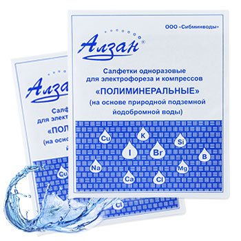 Изготовлены с использованием природной подземной лечебной минеральной воды, относящейся к группе "йодобромных". Состав этих изделий характеризуется наличием в них неизменённых природных химических компонентов минеральной воды - Na, Ca , Mn, K, Cl , Br , I, B , кремнекислоты, в микрограммовых количествах более 20 элементов таблицы Менделеева (Cu, Zn, Co, Li и т.п.). Общее количество природных веществ на 1 прокладке - 120мг. Салфетки имеют размер 9х11см. Форма выпуска: индивидуальный комплект из 20 одноразовых салфеток на 10 процедур. Предназначены для процедур СМТ-, ДДТ-, электрофореза, компрессов.