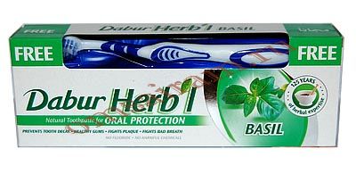 Натуральная аюрведическая зубная паста Dabur Herb’l Basil не содержит вредных химических веществ и фтора.