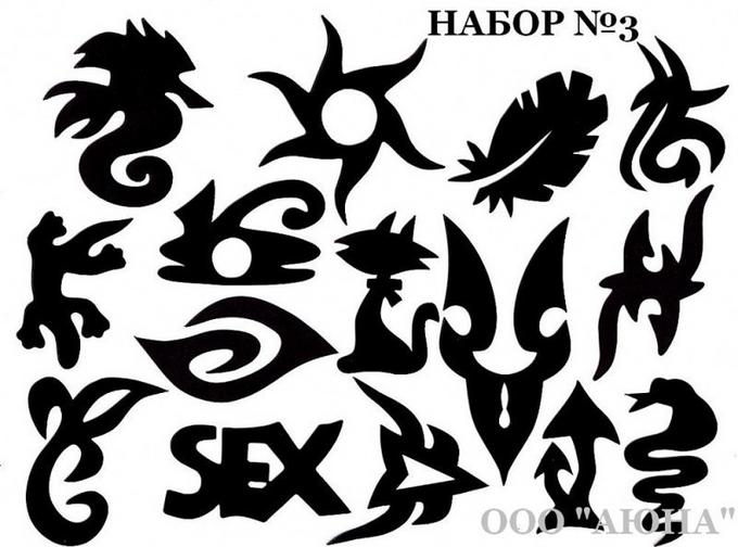 Усложнённые контуры. Набор 15 пластиковых фигурок для дизайна бикини и интимных стрижек. Сложные рисунки, требующие докраски техникой боди-арт или дорисовки хной. Можно использовать для создания контура блеск-тату (глиттер-тату), био тату хной, боди-арта.