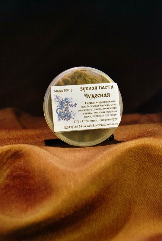 Состав: кедровый жмых, зола березовая вареная, мука горчичного семени, концентрат живицы кедровой, комплекс эфирных масел, полезных для десен.